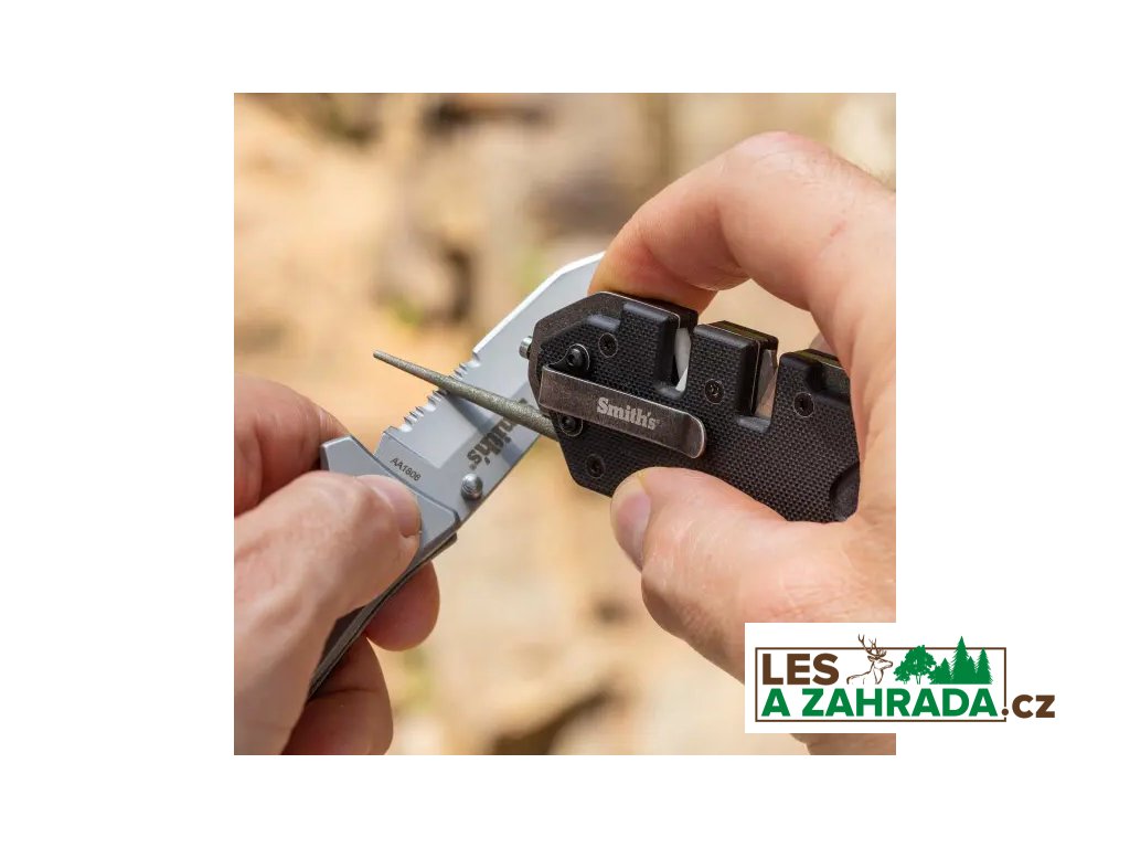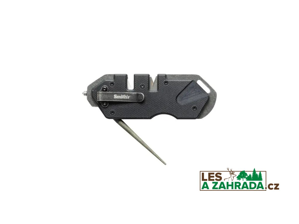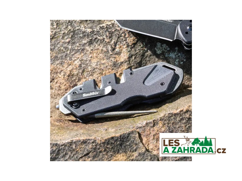 Taktický černý brousek Smith "Pocket Pal" má rukojeť z materiálu G-10 s rámem z nerezové oceli 420, přednastavené zkřížené karbidy a keramické kameny, které zajišťují vždy "dokonalé ostří". Navíc je vybaven wolframkarbidovým rozbíječem skla a kapesním klipem. Karbidy zajišťují rychlé nastavení ostří a speciálně tvarované keramické kameny jsou navrženy tak, aby vám poskytly ostré ostří na standardních nebo zoubkovaných hranách. Rozkládací, zúžená kulatá tyčka s diamantovým povrchem je určena k broušení zoubků a malých páracích háčků. Brousek je kompaktní, lehký, odolný a je vybaven otvorem na šňůrku.
