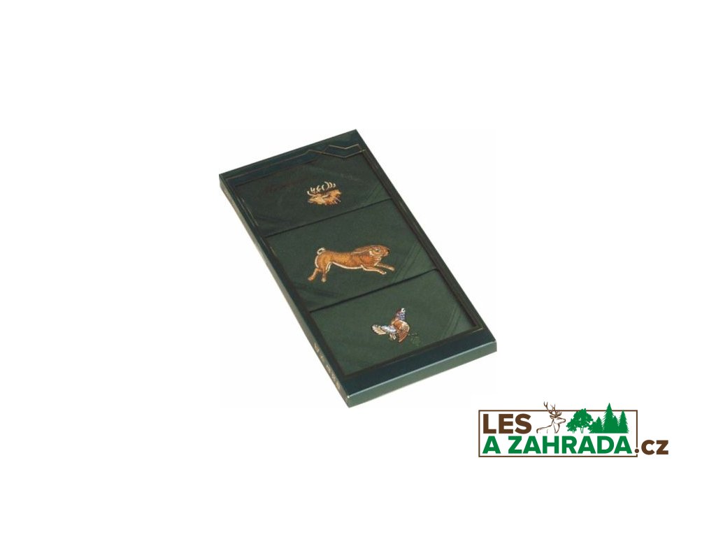 rozměry 42 x 42 cm, čistá bavlna, dárkové balení, lovecká zeleň, zdobeno loveckými motivy - srnec, kachna, tetřev