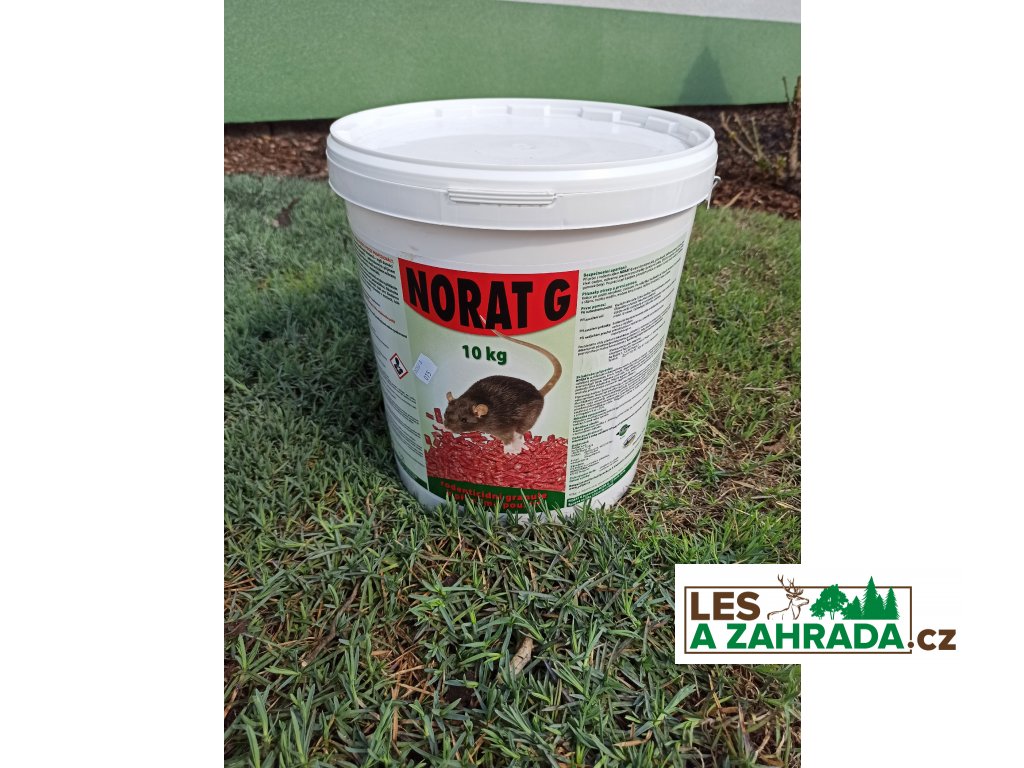 účinná látka: 50 mg / kg brodifacoum. Popis a působení: Účinná látka Noratu G brodifacoum patří mezi antikoagulační jedy. Po požití snižuje srážlivost krve a zvyšuje prostupnost krevních cest a zasažený organismus hyne vnitřním vykrvácením. Na hlodavce působí smrtelně již při jednorázovém požití, ale má i kurativní účinky. Norat G je hlodavci velmi dobře přijímán, úhyn nastává mezi 3 - 10 dnem po přijetí letální dávky a protože nástraha nevaruje, bylo by častější vkládání nástrah plýtváním. Nástrahy se vkládají na místa největšího výskytu hlodavců do děr, nor a skrýší podél stezek a jiná místa nejvíce navštěvovaná hlodavci. Mimo takto přirozeně chráněná místa se musí používat jedové staničky, do kterých vkládáme granule tak, aby byl zamezen styk s dětmi a domácímí zvířaty. Dávkování: Potkani a krysy: 20 - 80 g Noratu G na 100 m2 ( 10 - 15 granulí na několik míst ). Myš domácí: 5 - 25 g Noratu G na 100 m2 ( 3 - 5 granulí na několik míst ).