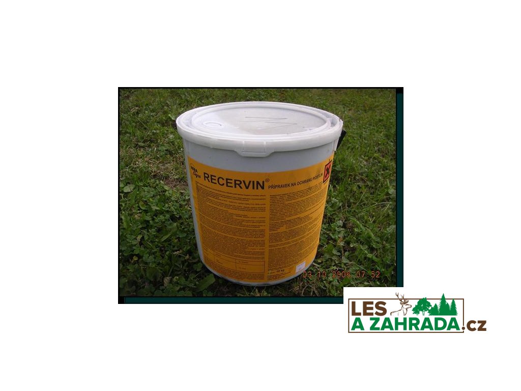 Charakteristika a použití přípravku v lesnictví:Repelentní přípravek k ošetření jehličnanů a listnáčů proti letnímu loupání a zimnímu ohryzu zvěří. Jde o stříkatelnou pastovitou směs mísitelnou s vodou, po zaschnutí již vodou nerozpustnou. Obsahuje směs repelentních a čichových látek s přísadou vytvářející na sazenicích a kmenech porézní ochrannou vrstvu. Recervin je určen výhradně k ochraně kmenů a kořenových náběhů jehličnatých a listnatých dřevin.Registrace v LH: Letní okus -NEZimní okus -NEOhryz a loupání kůry (prevence)-ANOAsanace po poškození kmenů-NEŠkody černou zvěří-NEHlodavci-NEPůsobení přípravku: Přípravek odpuzuje zvěř pachem.Fytotoxicita: jedná se o nefytotoxický přípravek. Registrované dávky: Druh ochranyDávkaTermín a způsob ošetřeníloupání a ohryz110-130 kg/100 stromůpostřik, celoročně, ředí se 3:1nátěr, celoročně, neředí sePoznámka ke způsobu použití: