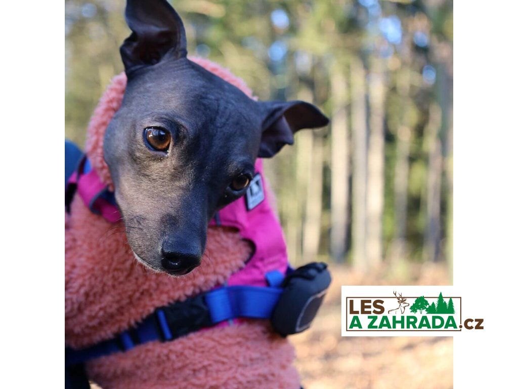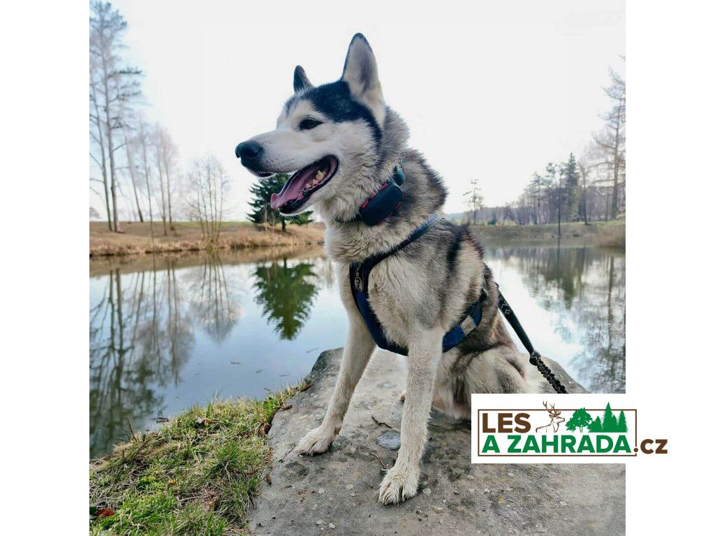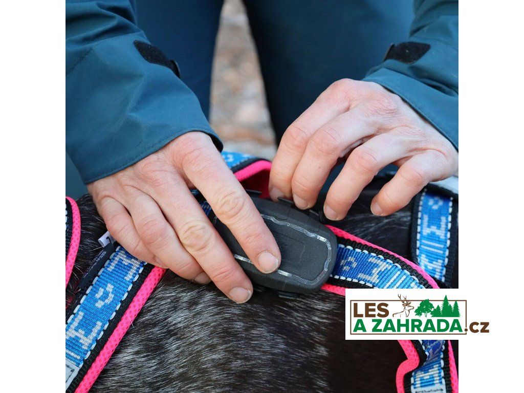 - fixační červená spona pro připevnění k obojku či postroji