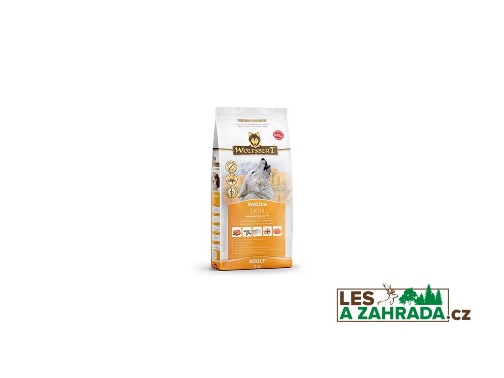 WOLFSBLUT VetLine SKIN je kompletní dietní krmivo pro dospělé psy pro podporu funkce kůže při dermatóze a nadměrném vypadávání srsti a pro snížení příznaků intolerance surovin a živin v souvislosti s chronickým svěděním, zánětem vnějšího ucha a gastrointestinálními onemocněními.
